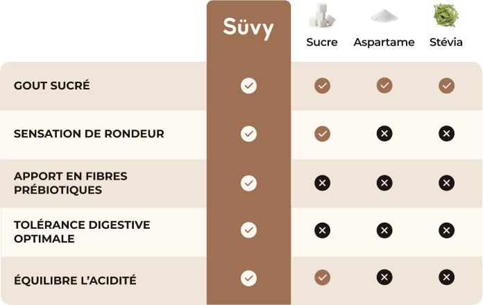 Composé de polydextrose (fibre prébiotique) et d’érythritol (issu de fruits fermentés), Süvy respecte votre microbiote et n’induit aucun pic glycémique.
